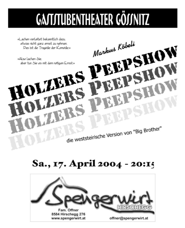 Markus Köbeli wurde am 20. Januar 1956 in Bern geboren.Nach einem abgebrochenen Studium und einem einjährigen Asienaufenthalt hatte er zu Beginn der 80er Jahre die Idee, vom Schreiben leben zu wollen. Also begann er 1982, Beiträge für das Radio zu verfassen. Es folgten kabarettistische Hörspiele, diverse Kurzgeschichten und der erste Roman “Ich und Ich”. 1987 schrieb Köbeli mit “Zimmer frei” sein erstes Theaterstück. Zwei Jahre später, 1989 schließlich entstand “Holzers Peepshow”, sein bislang erfolgreichstes Bühnenwerk mit Übersetzungen in französischer, englischer und polnischer Sprache.